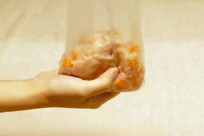 ポリ袋にごぼう、にんじん、鶏ひき肉、調味料の材料を全て入れ、よく揉み合わせて丸く形成する。