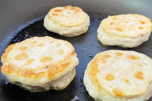 フライパンに油を熱し、レンコンの面から焼いていく。両面に焼き色がついたら蓋をして弱火で5分ほど蒸し焼きし、混ぜ合わせたタレの材料を加えて全体にからめたら完成。