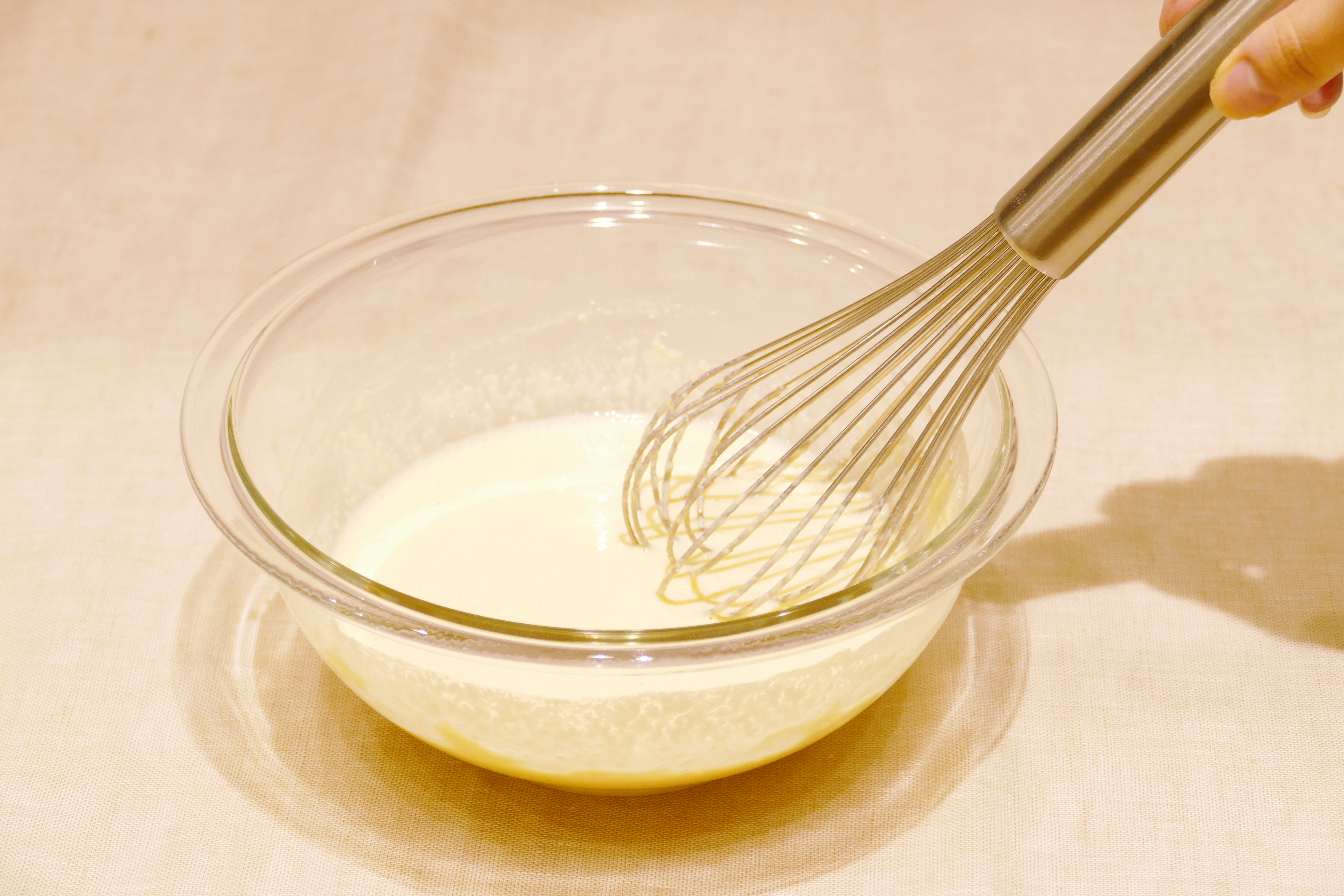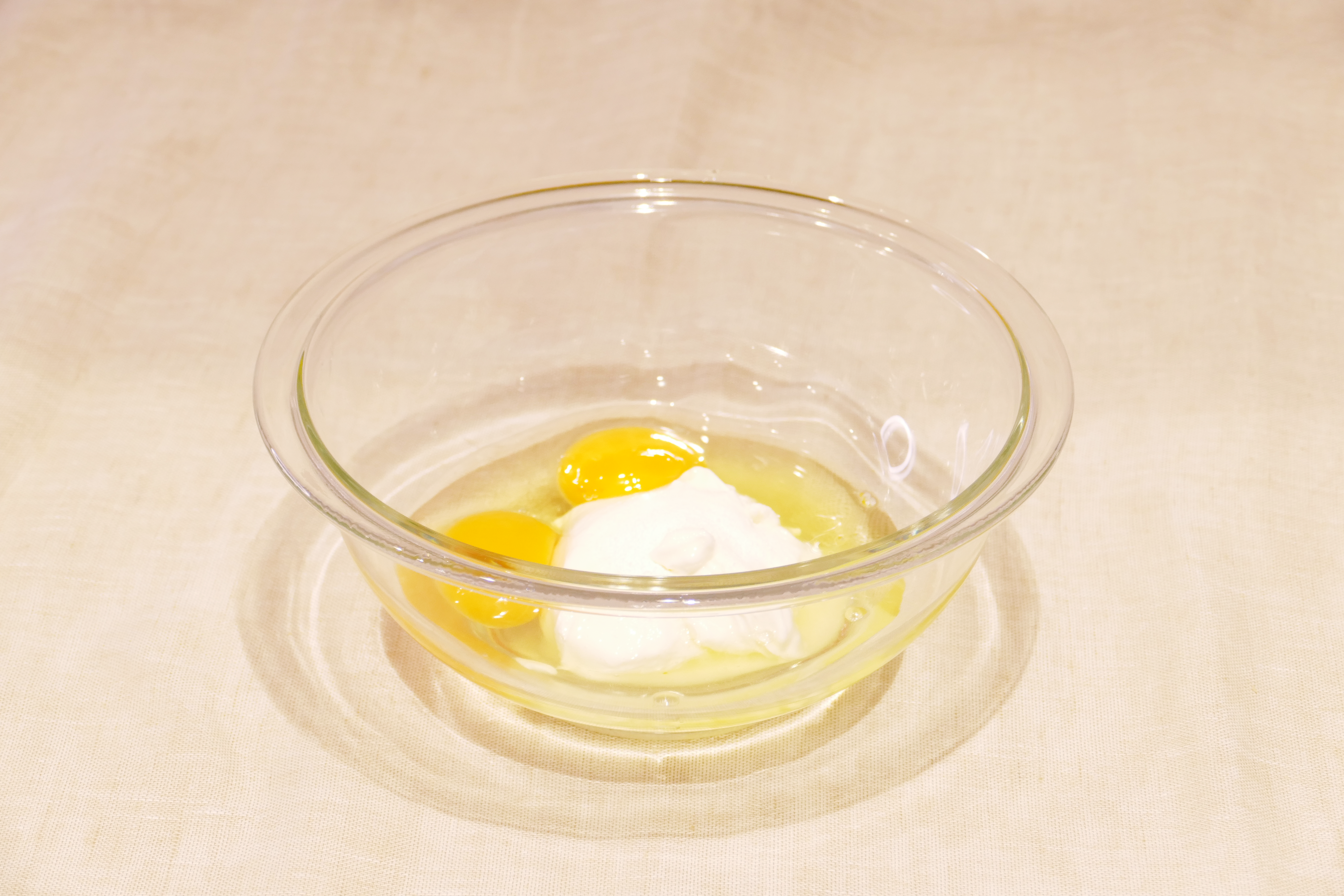 ボウルに低脂肪ヨーグルト・カロリーオフ甘味料・卵を入れてよく混ぜる。