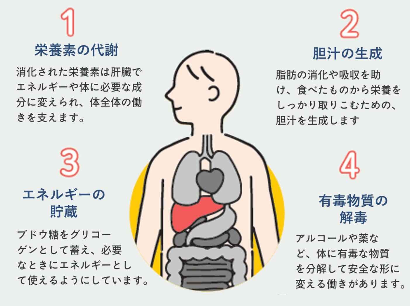 体内の工場とも呼ばれさまざまな役割があり、その中でも大きな4つの働きがあります。
